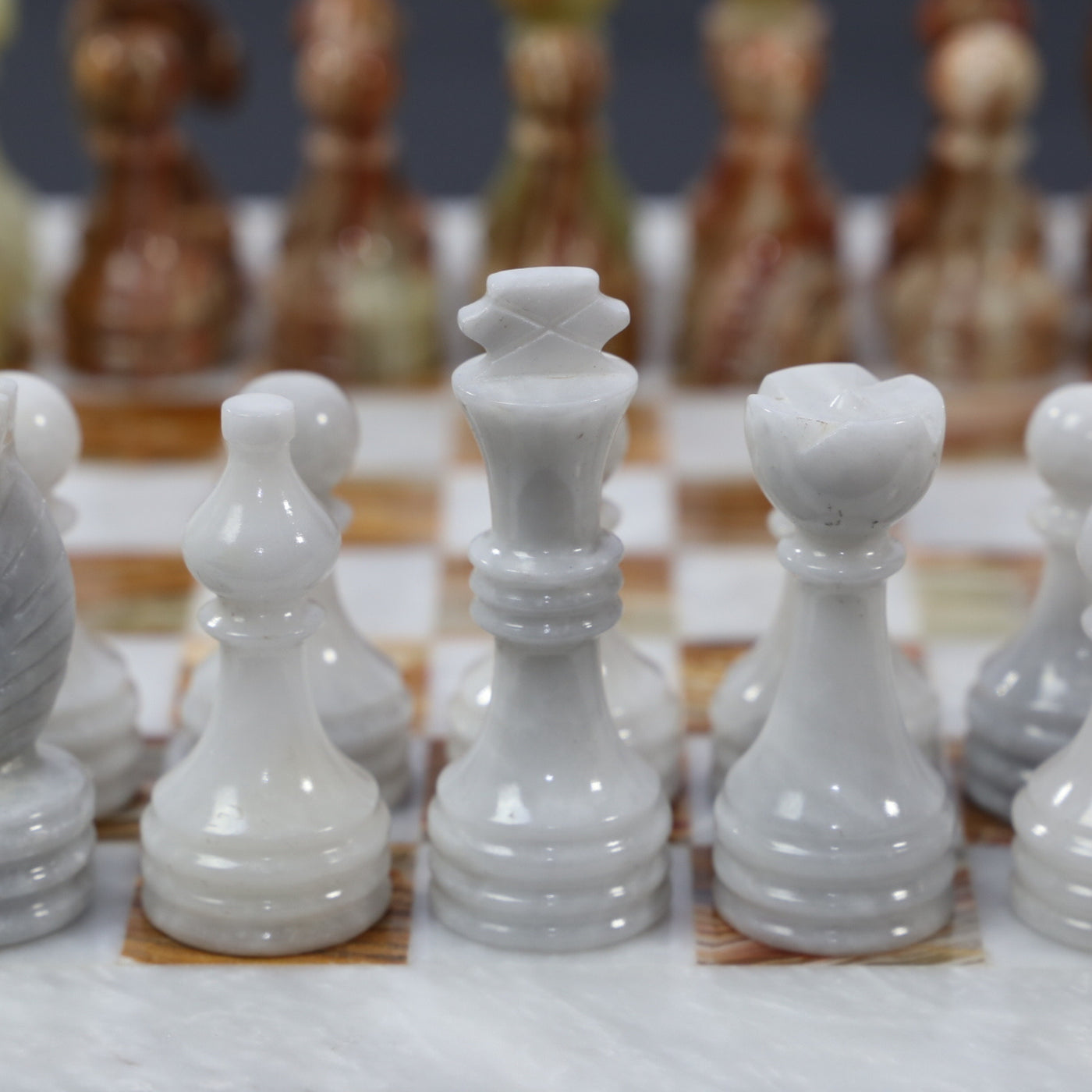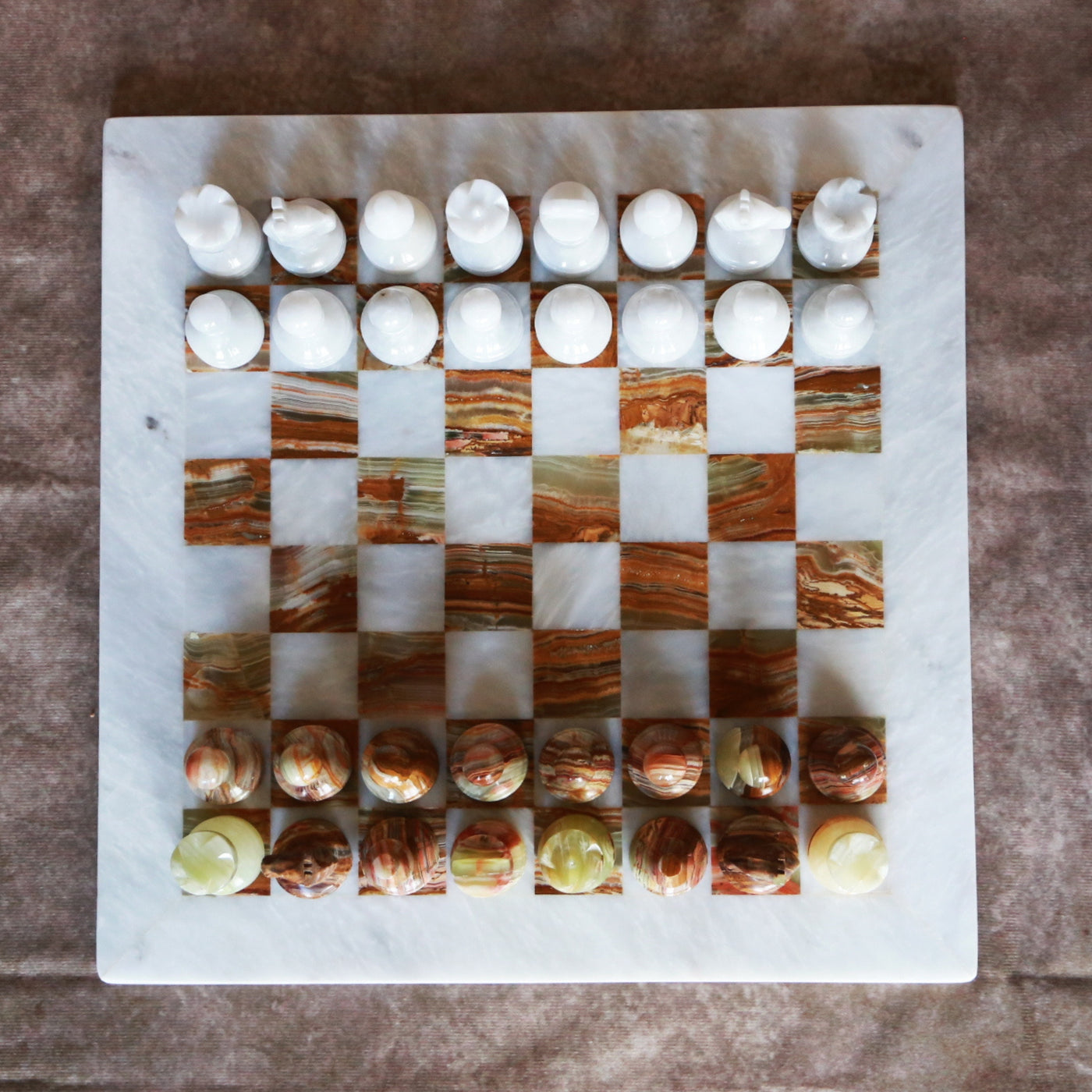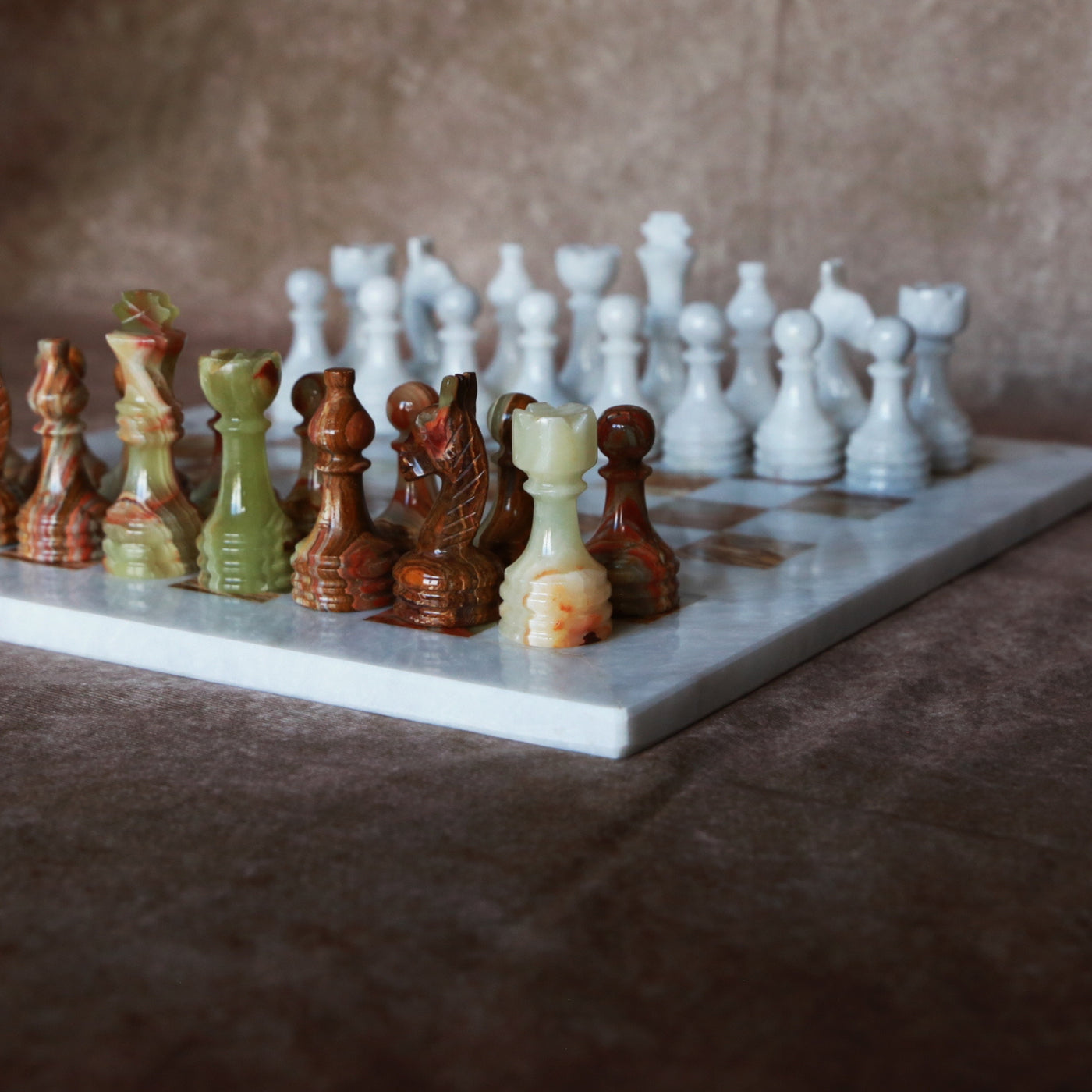 Introducing the ultimate chess set for those who appreciate the artistry and craftsmanship of handmade products. This exquisite, handcrafted chess set is crafted from natural onyx and white marble, creating a visually stunning contrast that will catch the eye.