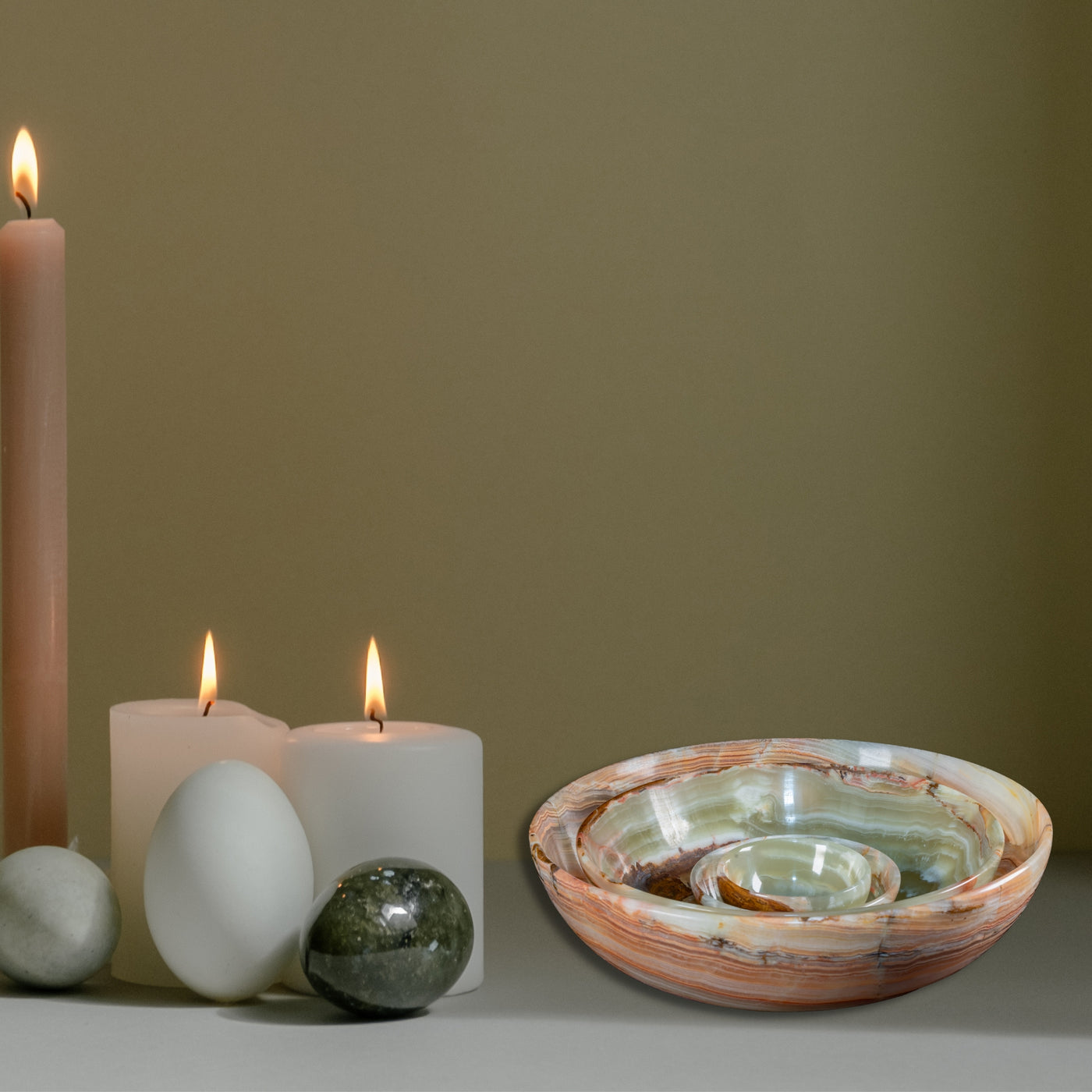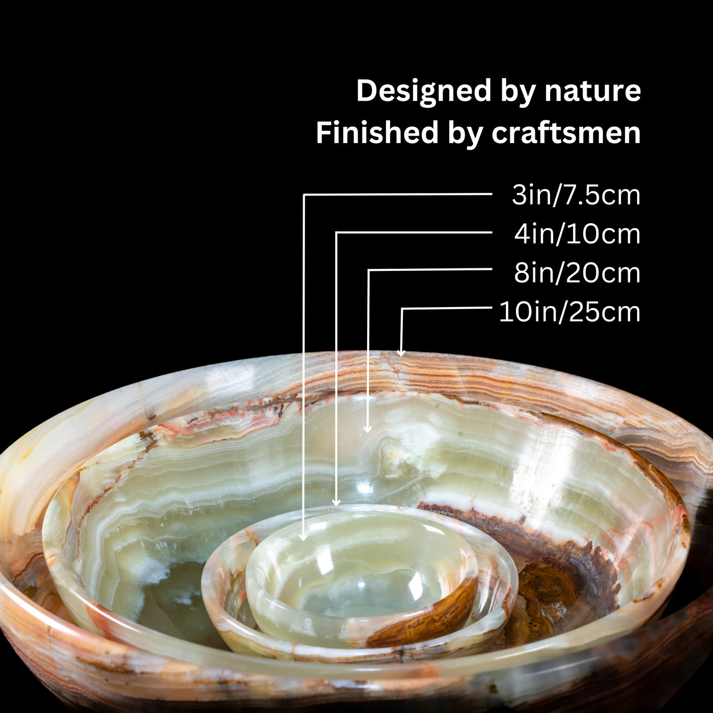 These beautiful onyx bowls are great for placing little trinkets or just around the house. They are made using the finest marble, carved and then polished to enhance the natural details of the stone with which it is made.