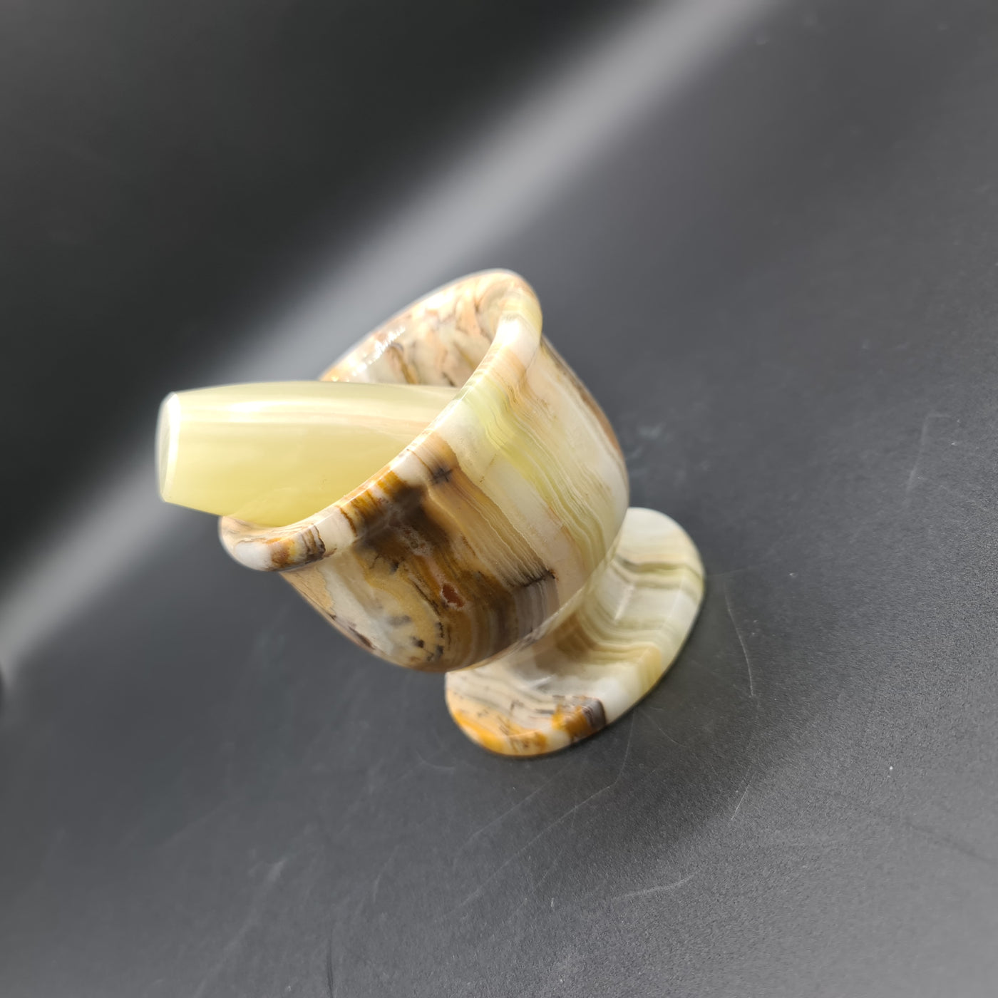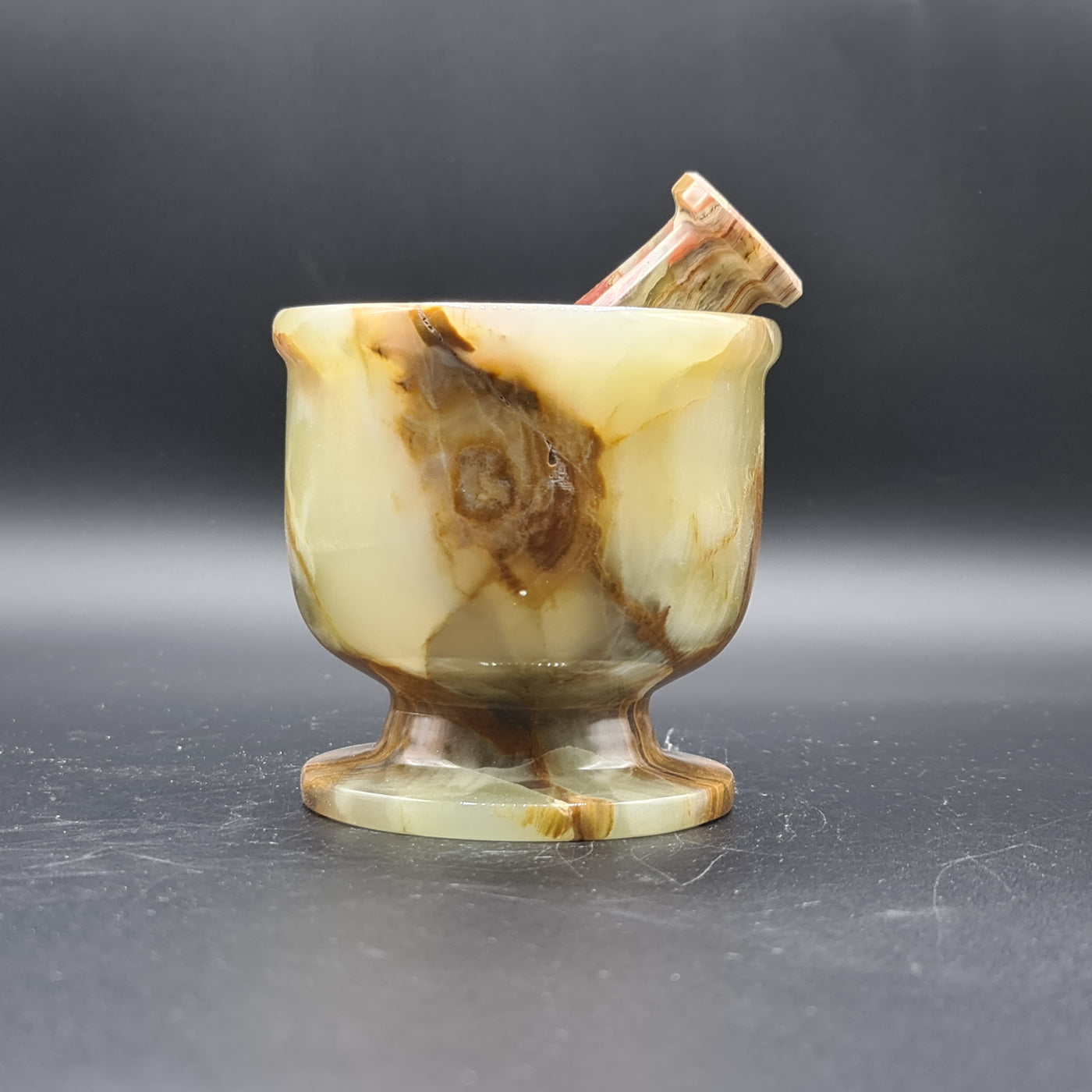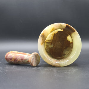 The Onyx Mortar and Pestle is a beautiful heirloom that would make a fabulous wedding or housewarming gift. Made from natural onyx, these items are perfect for grinding herbs and spices in your home kitchen. Each piece of our mortar and pestle is a unique treasure with a rich history. Not only does this product have aesthetic appeal but Onyx is said to get rid of negative energy and improve strength. When using the Mortar and Pestle for culinary purposes please ensure you thoroughly clean off with soap before use because it may be dangerous if the stone carries residue from previous activities.